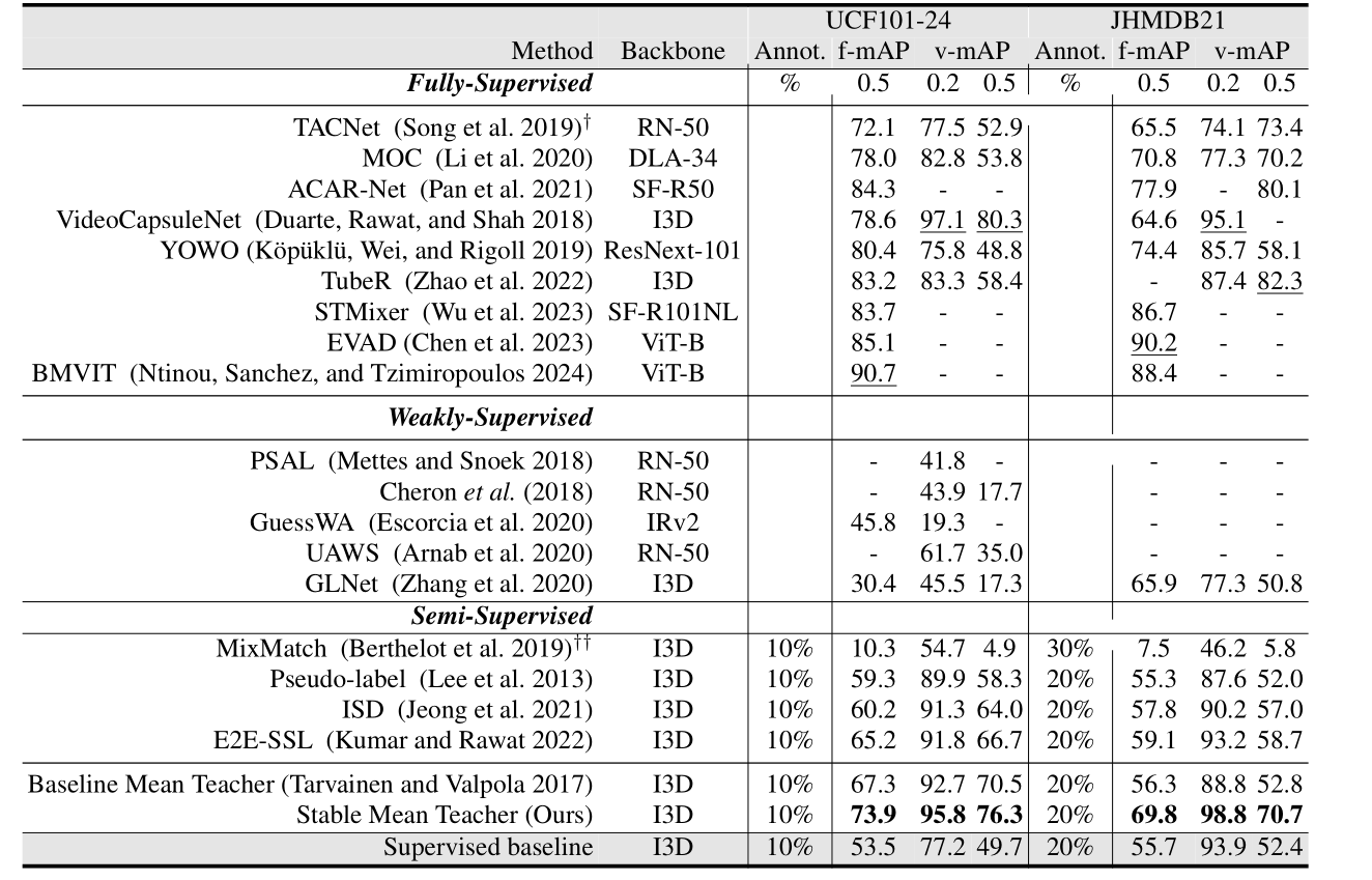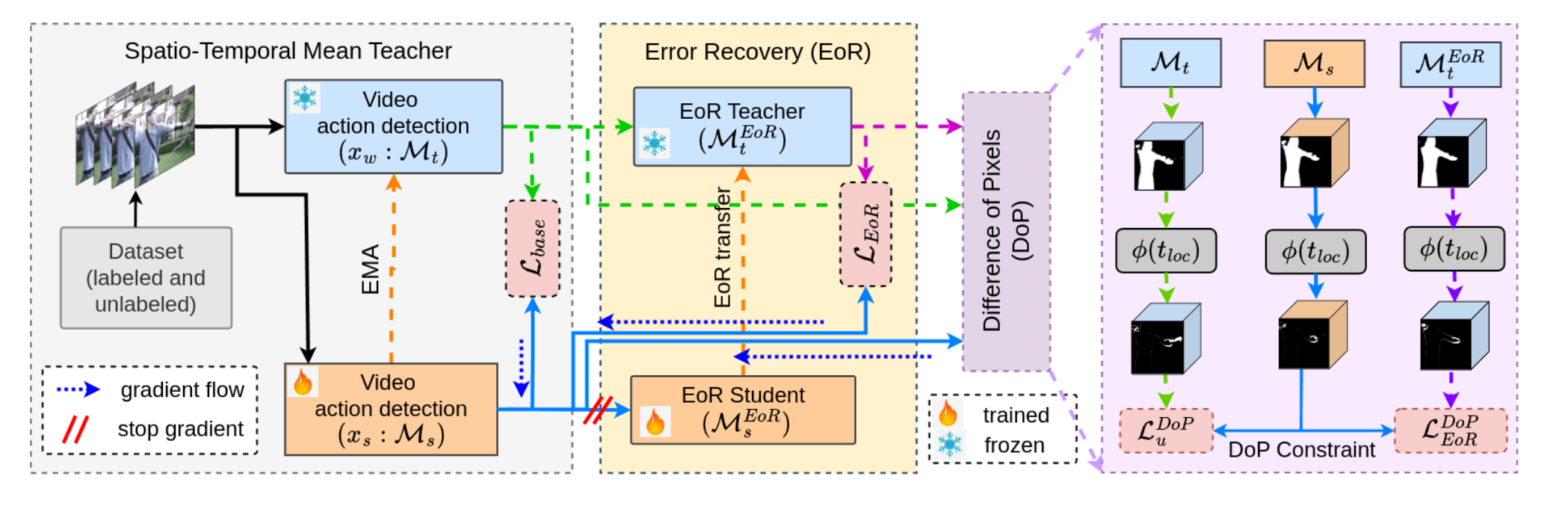 稳定均值教师模型包含一个新颖的错误恢复(EoR)模块,该模块从学生在有标记样本上的错误中学习,并将这种学习成果传递给教师,以改进在无标记数据集上生成的时空伪标签。EoR 改善了伪标签,但忽略了时间一致性,而这对于动作检测很重要。为克服这一问题,我们引入像素差异(DoP),这是一种简单且新颖的约束条件,专注于时间连贯性,有助于从无标记样本中生成一致的时空伪标签。