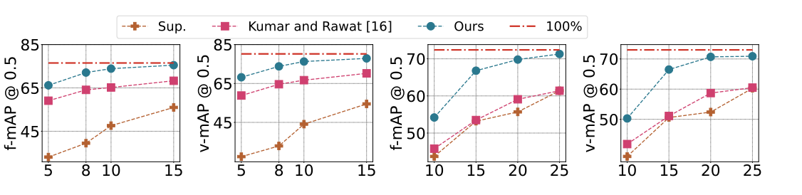 图1:性能概述:与在100%注释上训练的完全监督方法相比,稳定平均教师(Stable Mean Teacher)在使用10%标签(UCF101 - 24;左两个图)和20%标签(JHMDB - 21;右两个图)时,能提供相当的性能。在UCF101 - 24和JHMDB - 21数据集上,在所有不同比例的标记集下,它在f - mAP和v - mAP上始终以较大优势超过现有的最先进方法和监督基线。每个图中的x轴表示注释百分比。