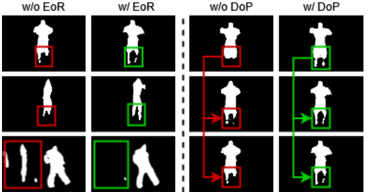 EOR模块增强了伪标签的空间定位。然而,在视频场景中,预测需要随时间保持一致性。为确保各帧之间的这种时间连贯性,我们引入了一种名为像素差异(DoP)的新型训练约束。这种方法的提出是由于传统损失函数存在局限性,它们主要强调帧或像素的准确性,常常忽略了时间连贯性。DoP 通过关注视频内的像素移动来弥补这一差距(图 3),并利用(LDoP)优化跨帧像素差异的准确性,ϕ表示时间差