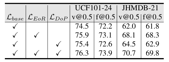在预测的时空伪标签上引入时间连贯性 。确保在视频序列中,相邻帧之间的动作预测具有时间上的一致性,避免出现不合理的动作跳跃 。 基于DoP约束,通过DoP损失函数对预测结果施加时间一致性(temporal coherency)约束 ,确保在时间维度上动作检测结果的连贯性。