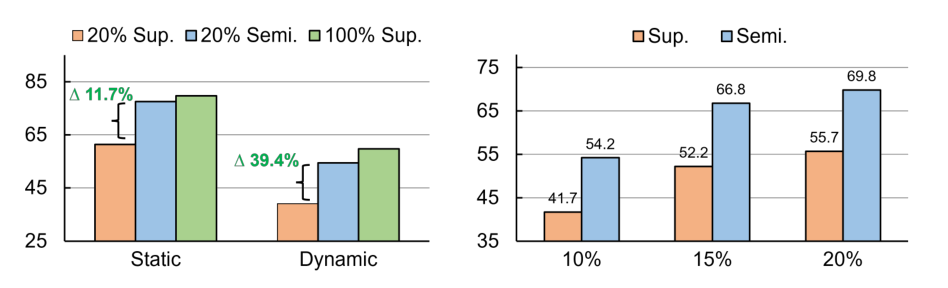 图5:稳定均值教师分析:(左)静态与动态场景:动态场景比静态场景更具挑战性,然而,动态场景下性能的相对提升比静态场景情况高出27.7%。Δ表示v-mAP@0.5的相对变化。(中)标注比例:在x轴上从右向左移动,性能增益(f-mAP@0.5)增加。这表明该方法在低标注数据情况下更有效。