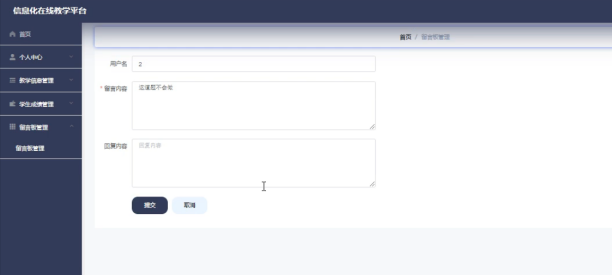 本信息化在线教学平台有管理员功能有个人中心,学生信息管理,教师信息管理,教学信息管理,学生成绩管理,留言板管理,系统管理等。教师可以对学生成绩进行管理和留言回复。学生可以在线考试和留言。因而具有一定的实用性。