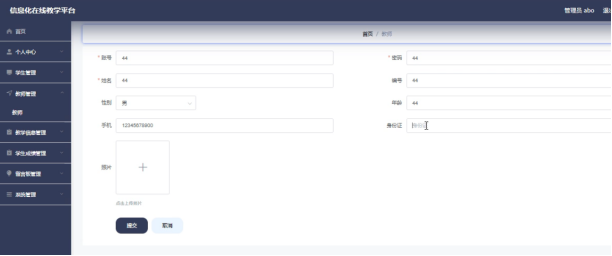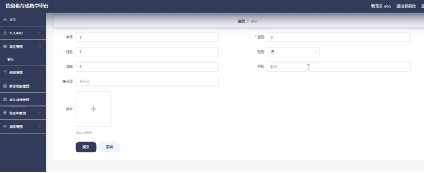 信息化在线教学平台的系统管理员可以管理学生信息检,可以对学生信息信息添加修改删除以及查询操作。具体界面的展示如图所示。