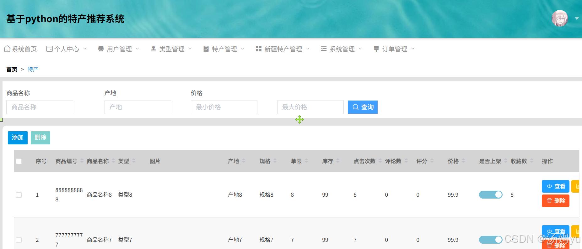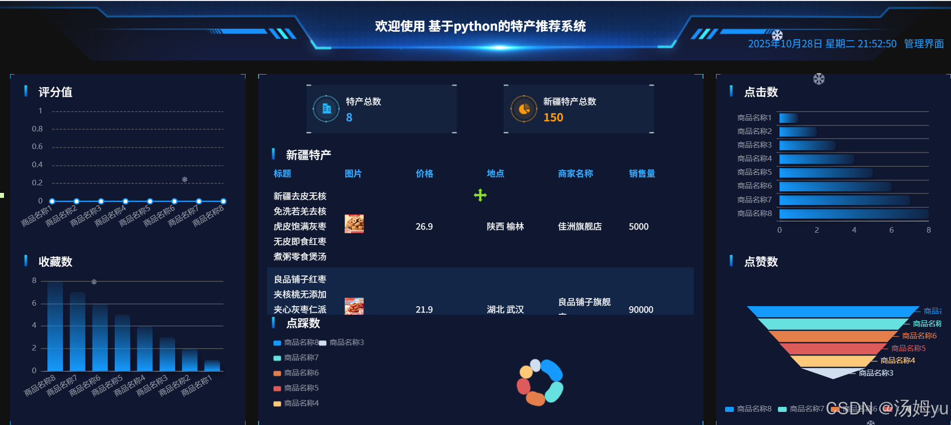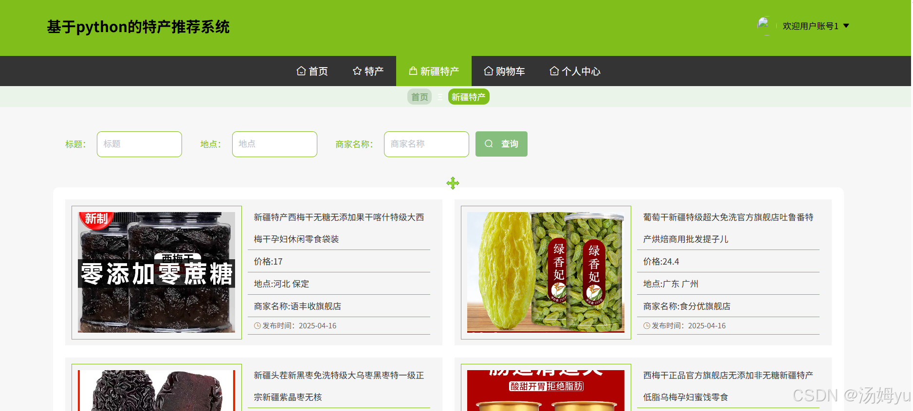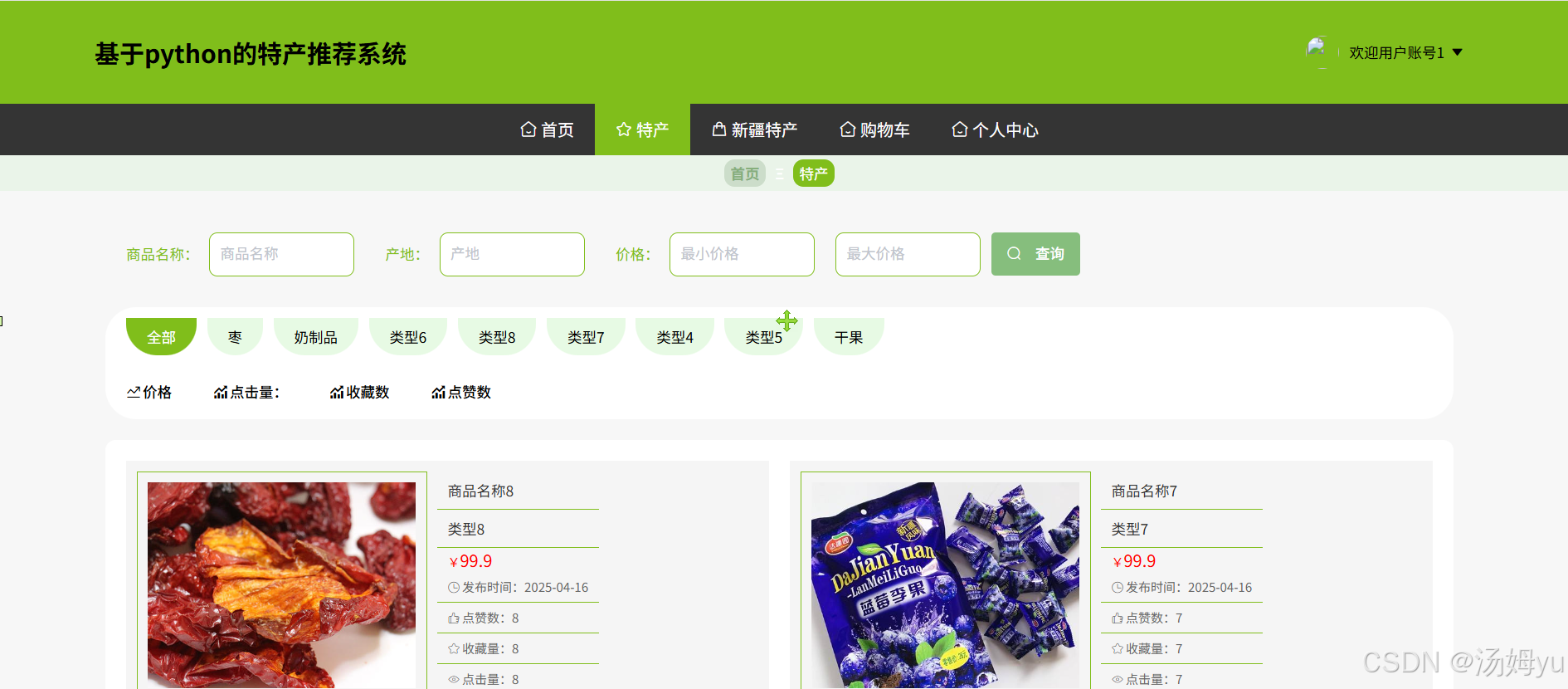 在学术研究层面,基于 Python 大数据的特产推荐系统融合了计算机科学、数据科学、市场营销学等多学科知识,为跨学科研究提供了新的实践范例。利用 Python 强大的数据处理能力,对海量的特产数据以及用户行为数据进行深度挖掘与分析,能够探索出适用于特产领域的用户兴趣建模方法和推荐算法优化策略,丰富和完善现有的推荐系统理论体系。同时,该研究有助于深入理解用户购买特产的决策过程和影响因素,为消费者行为学研究提供新的视角和数据支持,推动相关学科理论的创新发展。对于消费者而言,此系统能够根据其历史购买记录、浏览行为、地理位置等多维度信息,精准推荐符合其口味和需求的特产,节省消费者在海量特产中筛选的时间和精力,提升购物效率和满意度,让消费者轻松选购到心仪的特色产品,增强旅游消费体验。从特产商家角度,系统可以帮助商家深入了解消费者的偏好和市场需求,实现精准营销。商家能够根据推荐反馈调整产品策略,优化产品种类和库存管理,提高产品的市场适应性和竞争力,增加销售额和利润。对于特产产业整体发展,该系统有助于打破地域限制,扩大特产的市场覆盖范围,促进特产的流通和销售,推动特产产业的规模化、标准化发展。同时,通过挖掘特色特产,弘扬地域文化,提升地方特产的知名度和美誉度,实现文化与经济的良性互动,助力地方经济发展和乡村振兴。