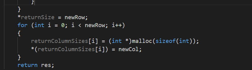 for (int i = 0; i < newRow; i++) {// 给具体列数分配内存(相当于写一张数值纸条)(*returnColumnSizes)[i] = (int*)malloc(sizeof(int));// 把列数写进数值内存里*((*returnColumnSizes)[i]) = newCol;