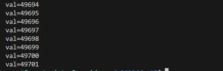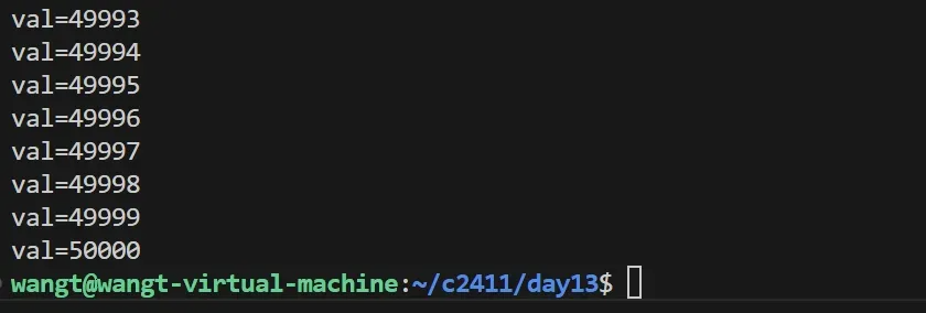 我们可以通过观察发现次代码并没有符合我们的预期打印50000,这是因为多个线程同时对val++造成的,为了解决这种现象我们利用互斥锁来来进行控制。