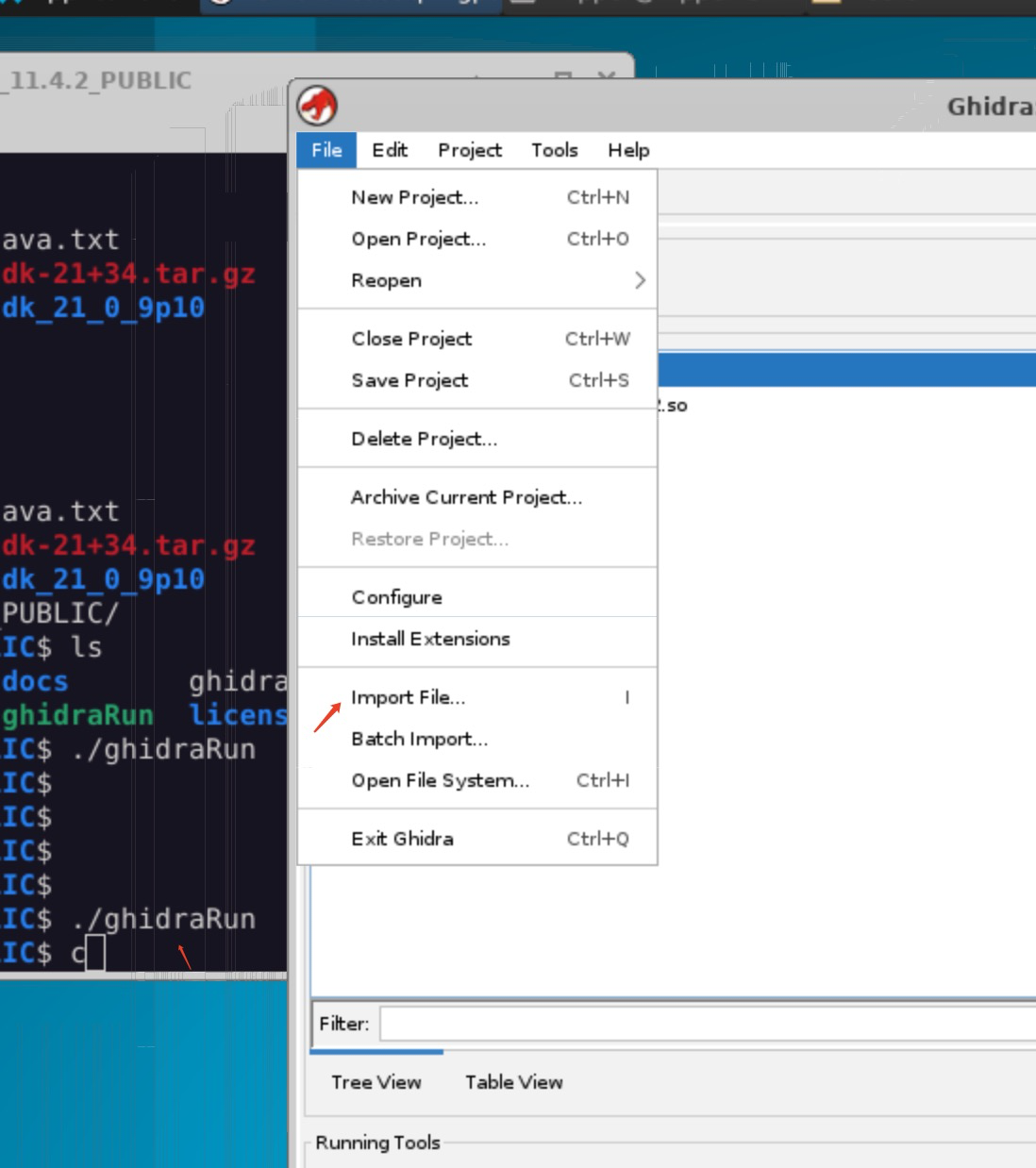 在图形桌面上打开 terminal,然后通过命令行打开 ghidraRun