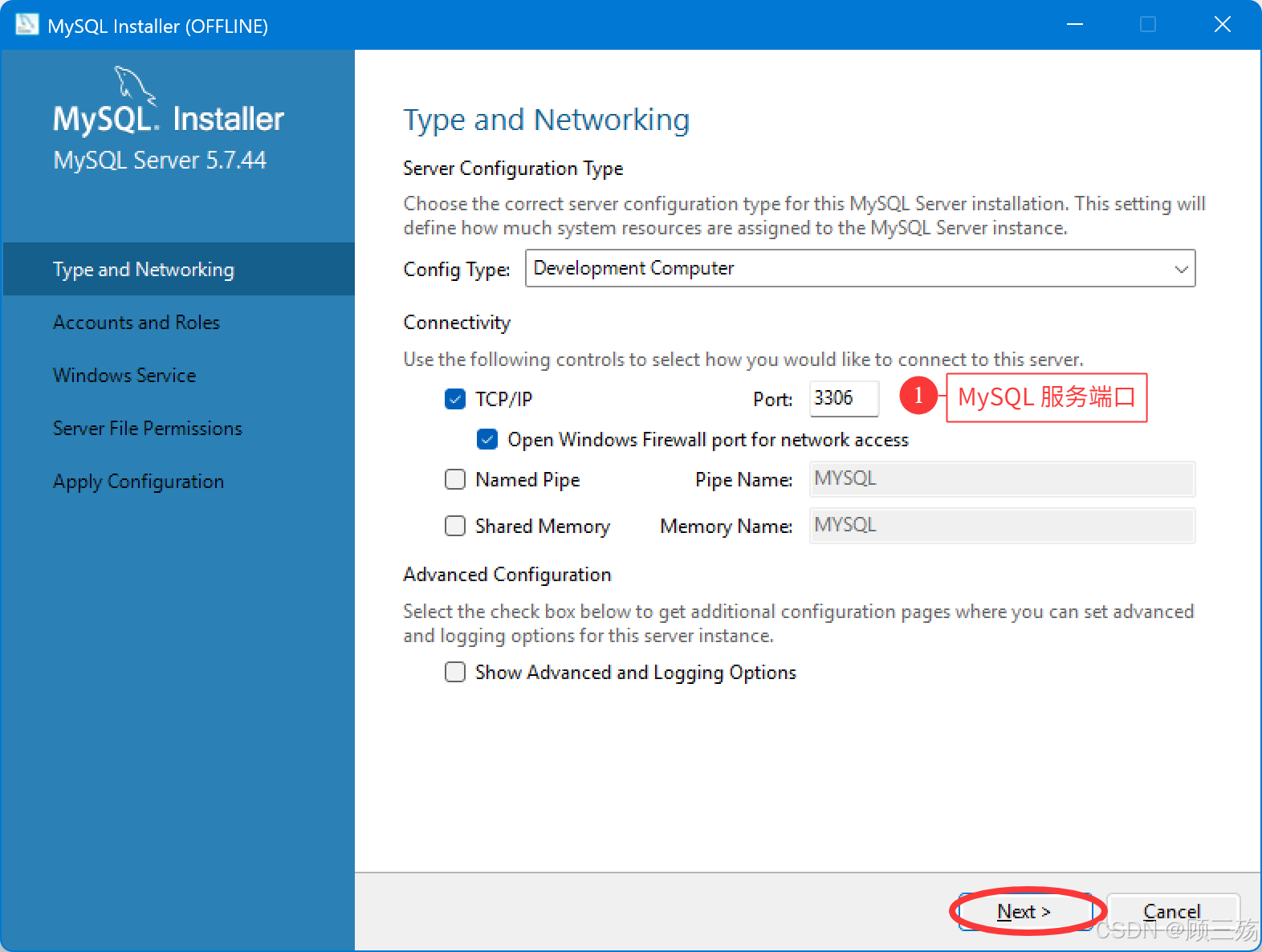 - □ TCP/IP 端口:3306 □ 打开 Windows 防火墙端口以允许网络访问