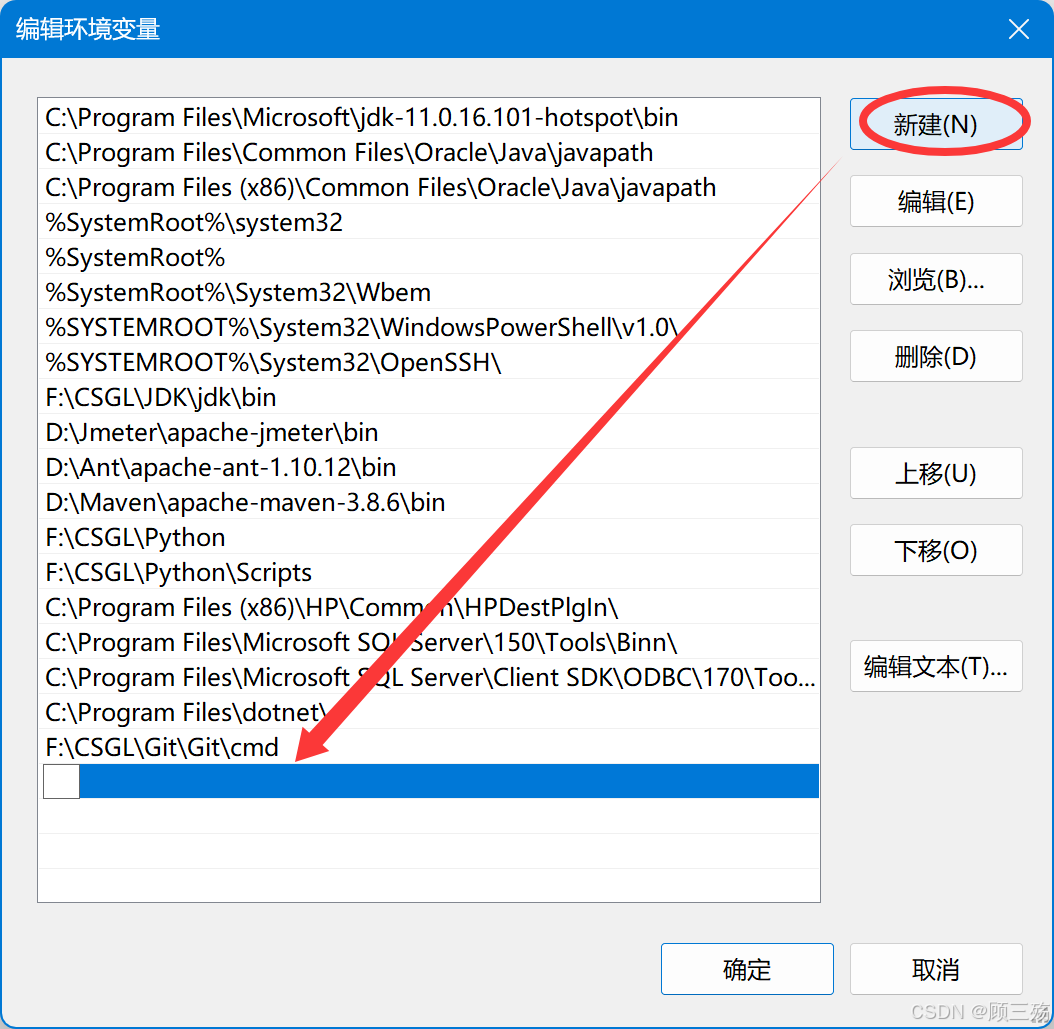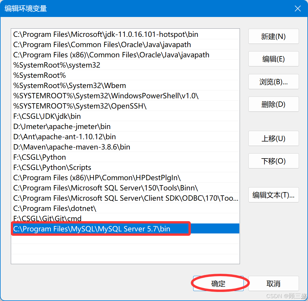 点击编辑 Path 系统变量,新增浏览填上 MySQL 的 bin 目录路径,确定保存: