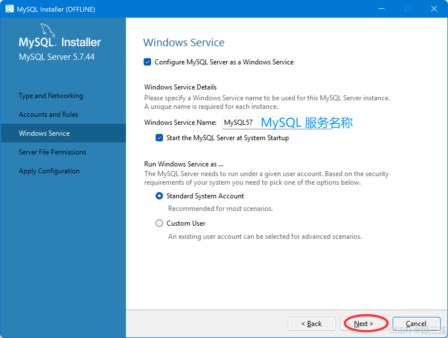 - 请指定用于此 MySQL Server 实例的 Windows 服务名称。
