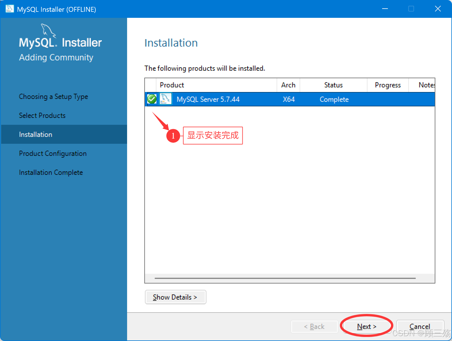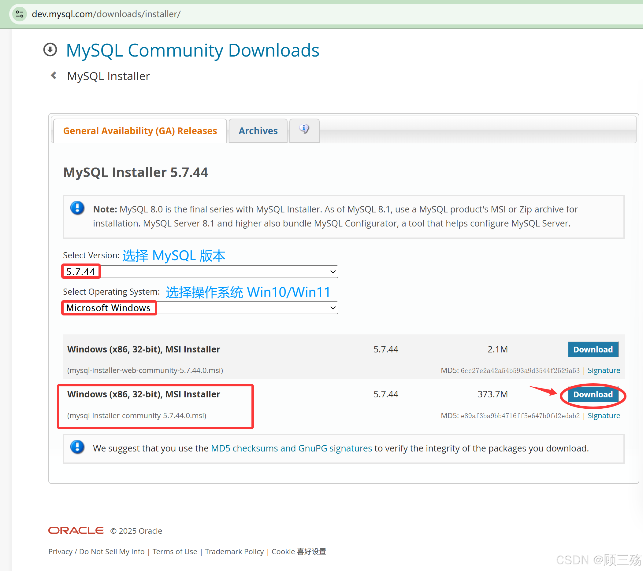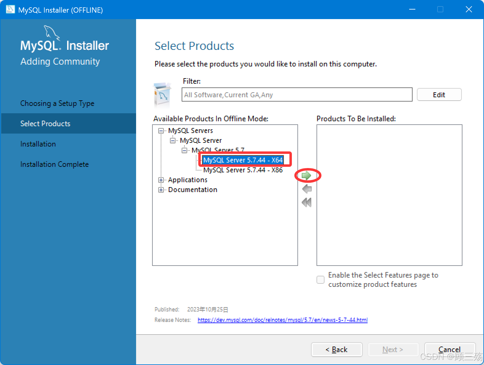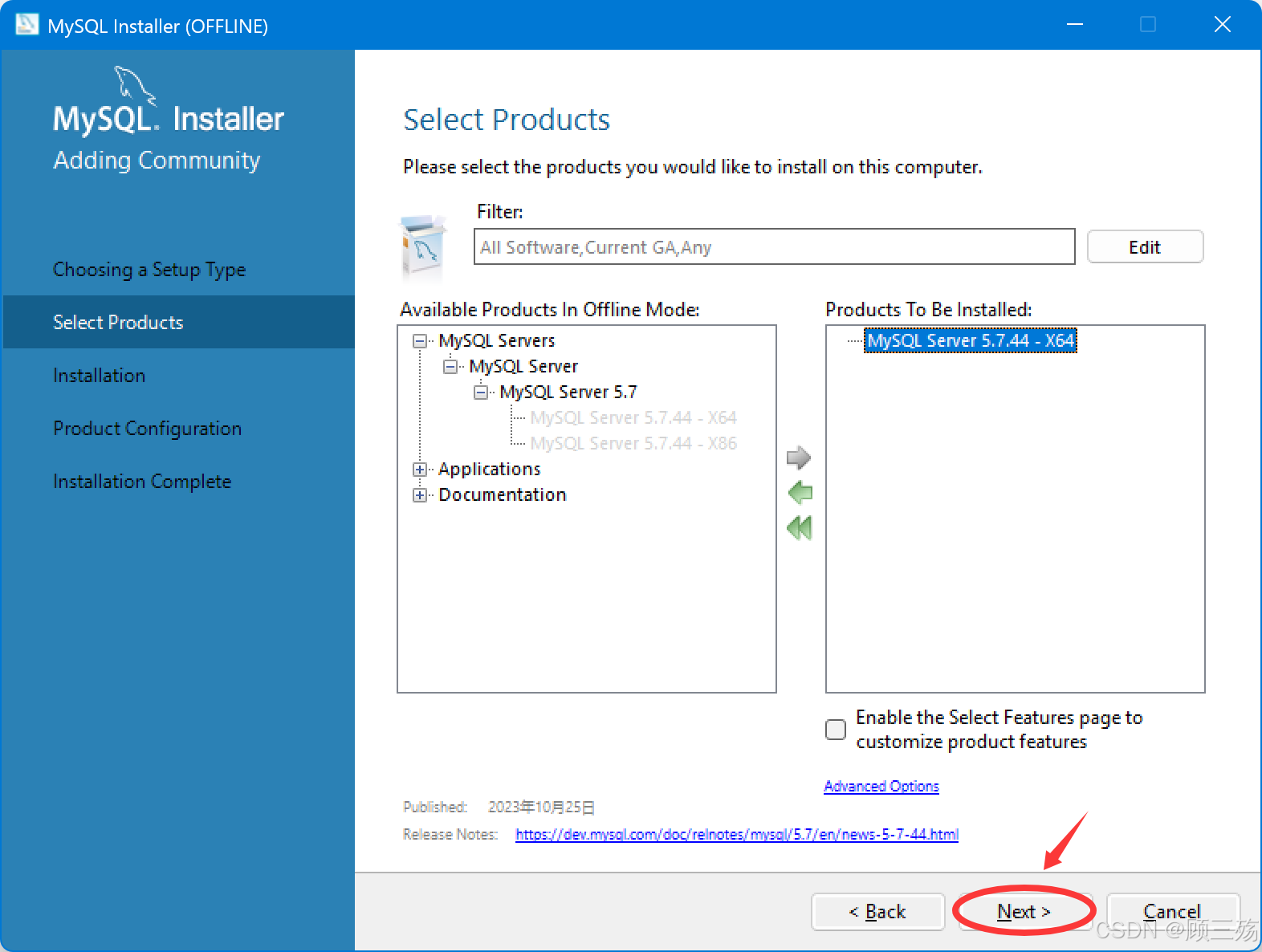 - 选择 64 位安装版本:MySQL Server 5.7.44 - X64