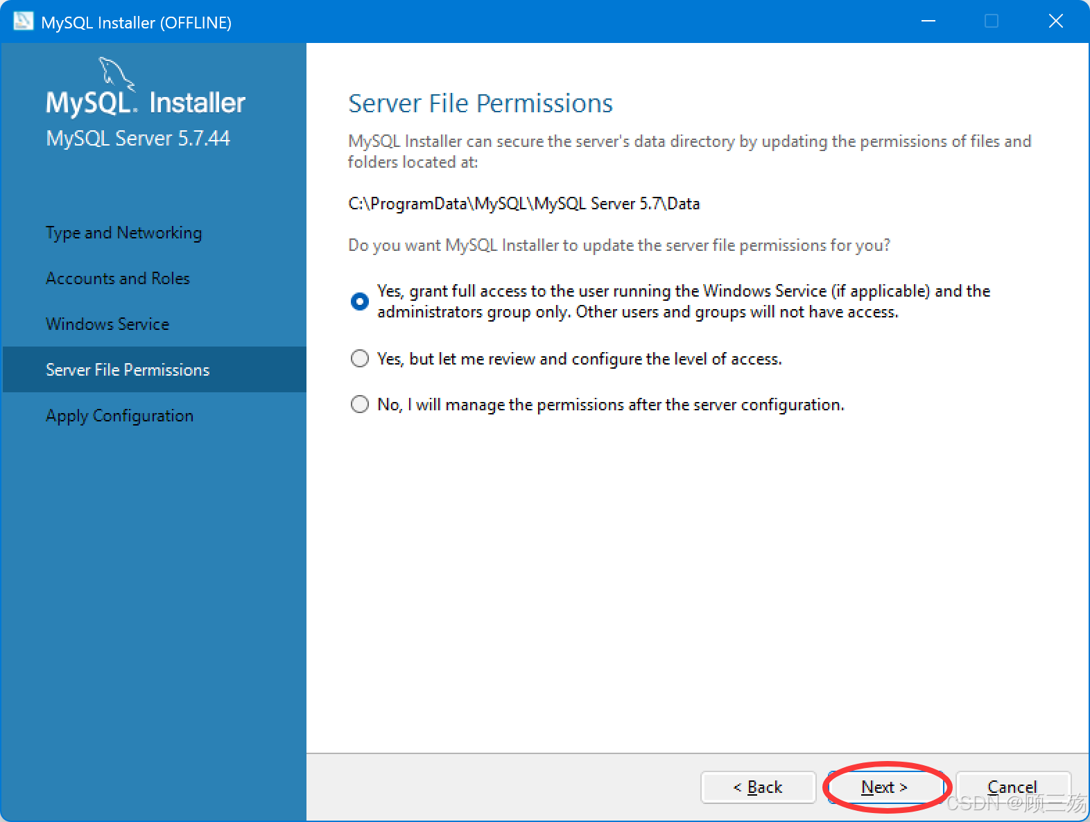 您是否希望 MysQL 安装程序为您更新服务器文件权限?