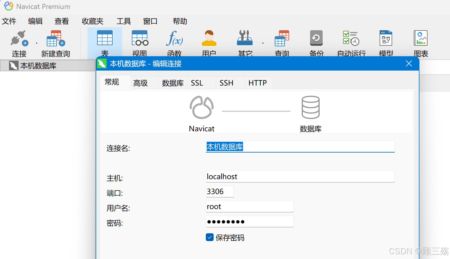 root)。- 密码:账号对应的密码(可选保存密码)(如