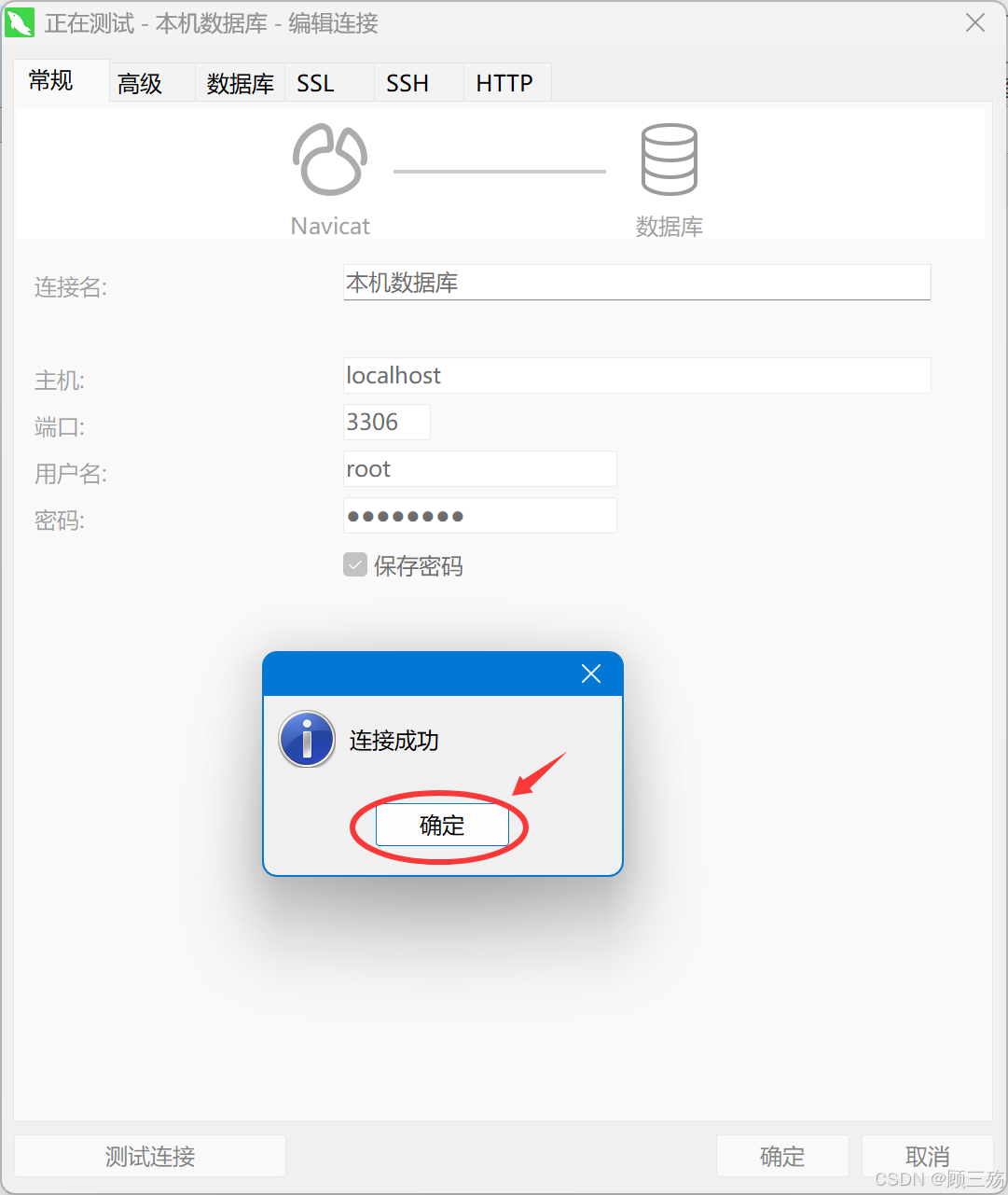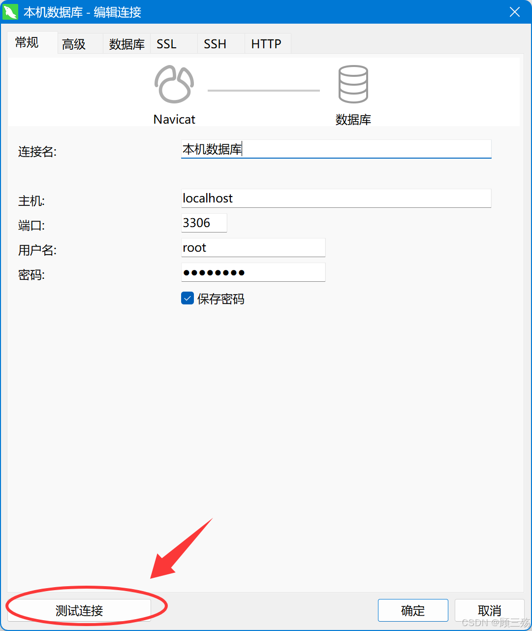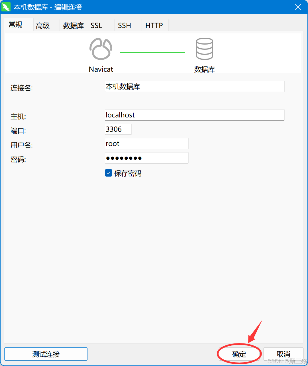 - 点击窗口左下角的 “测试连接” 按钮,确认配置信息正确且能成功连接数据库。