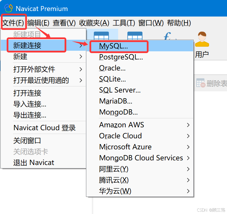 - 打开 Navicat 软件,点击顶部菜单栏的 “文件” 选项,选择 “新建连接” 。