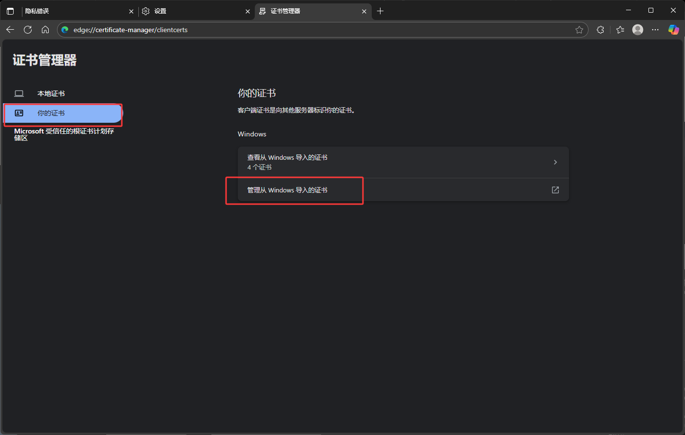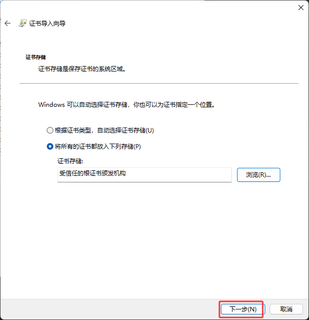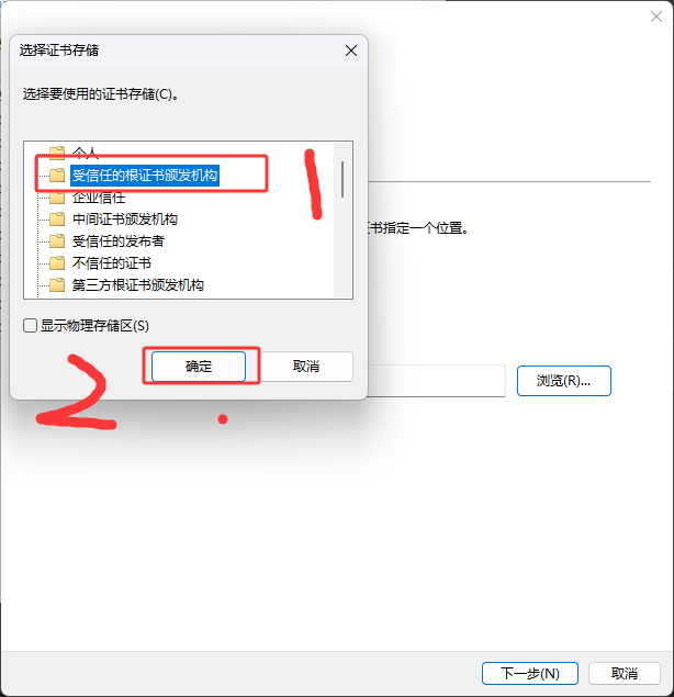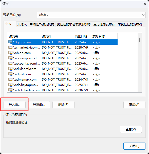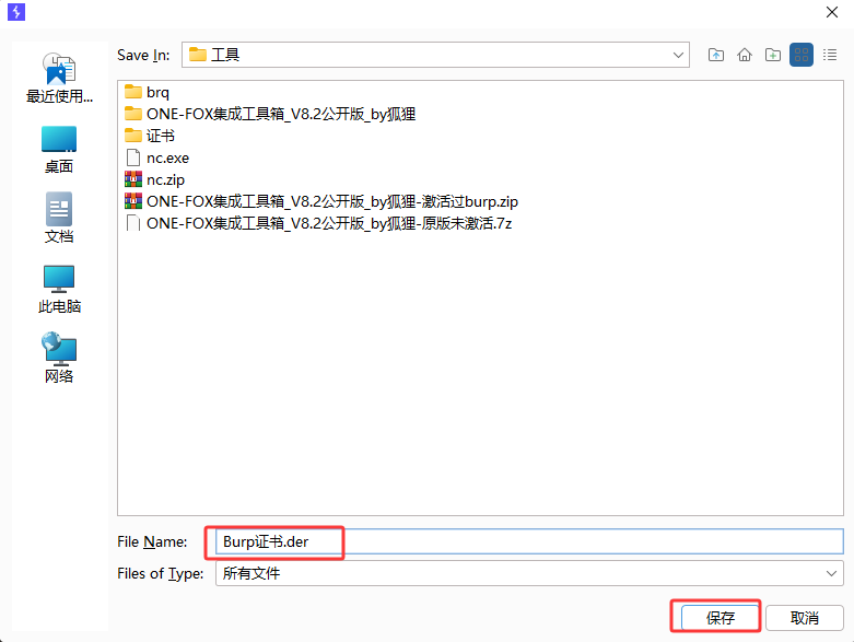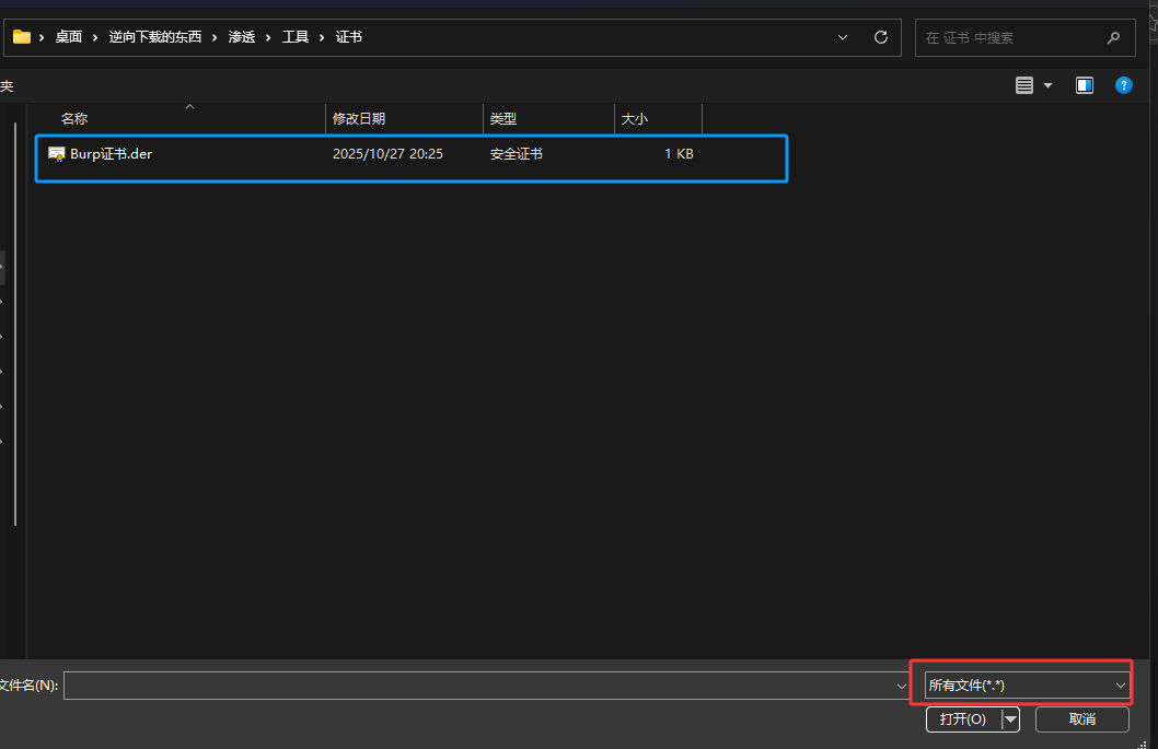 然后选择下图红框的所有文件(如果不选择是看不到我们保存的证书的),然后双击下图蓝框的证书就可以了
