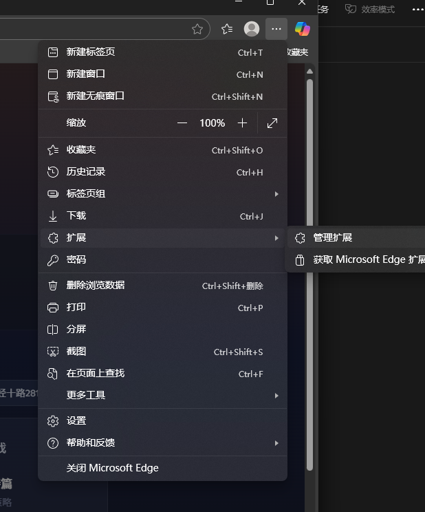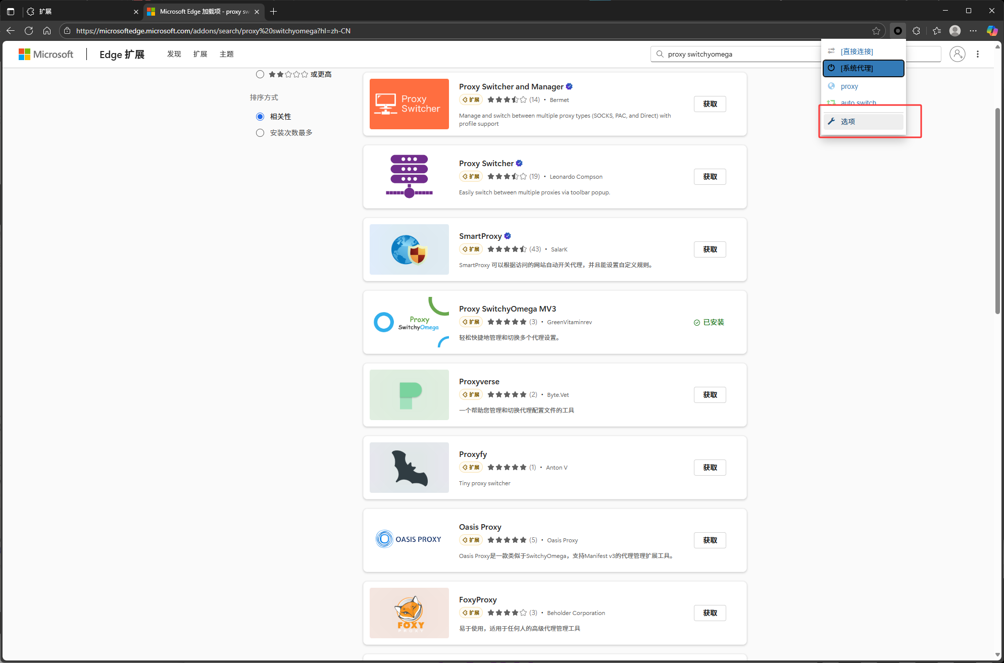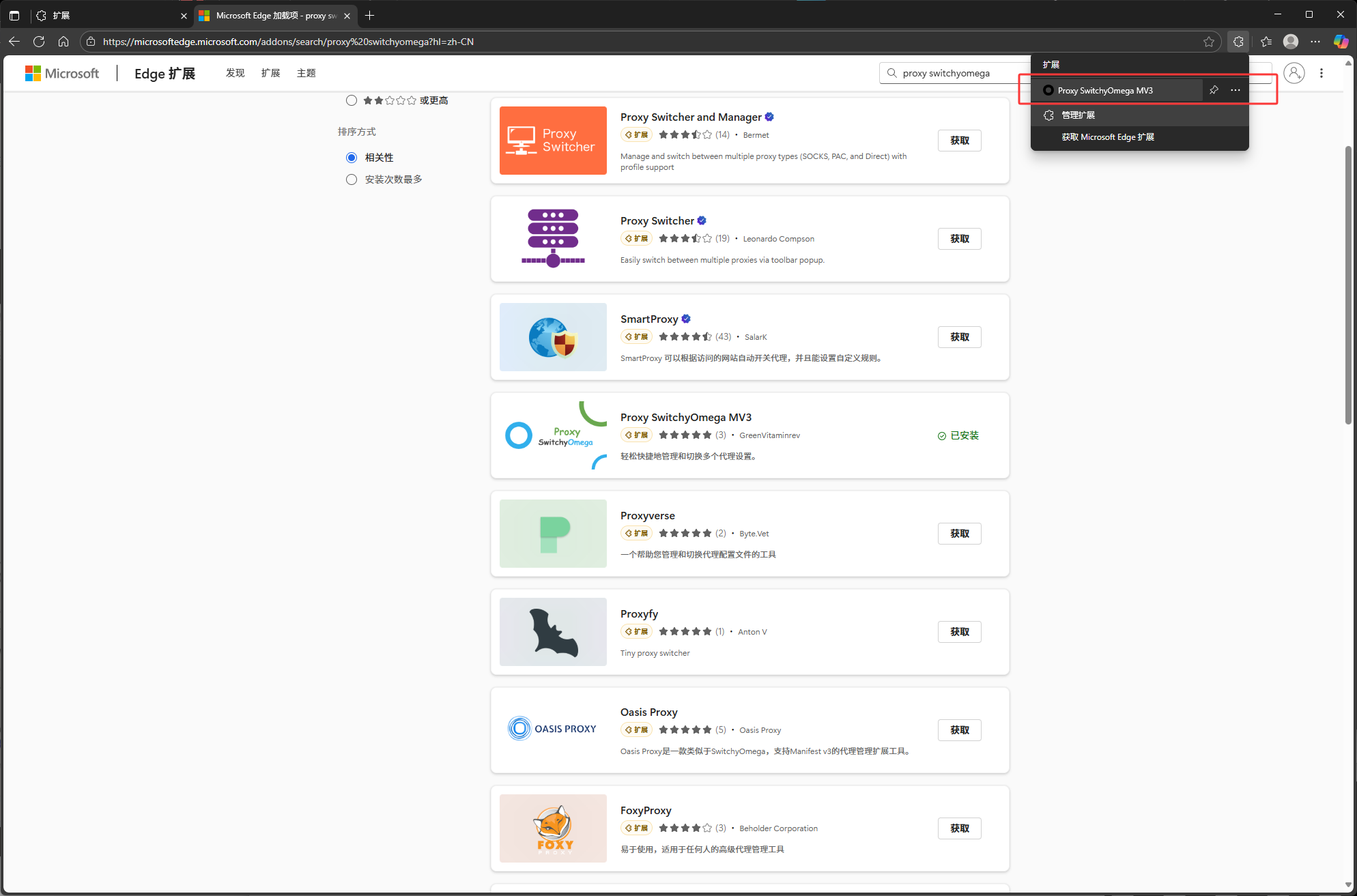 然后来到浏览器,进行代理设置,这里用的MicrosoftEdge浏览器,其它浏览器也都一样,打开浏览器后点击管理扩展