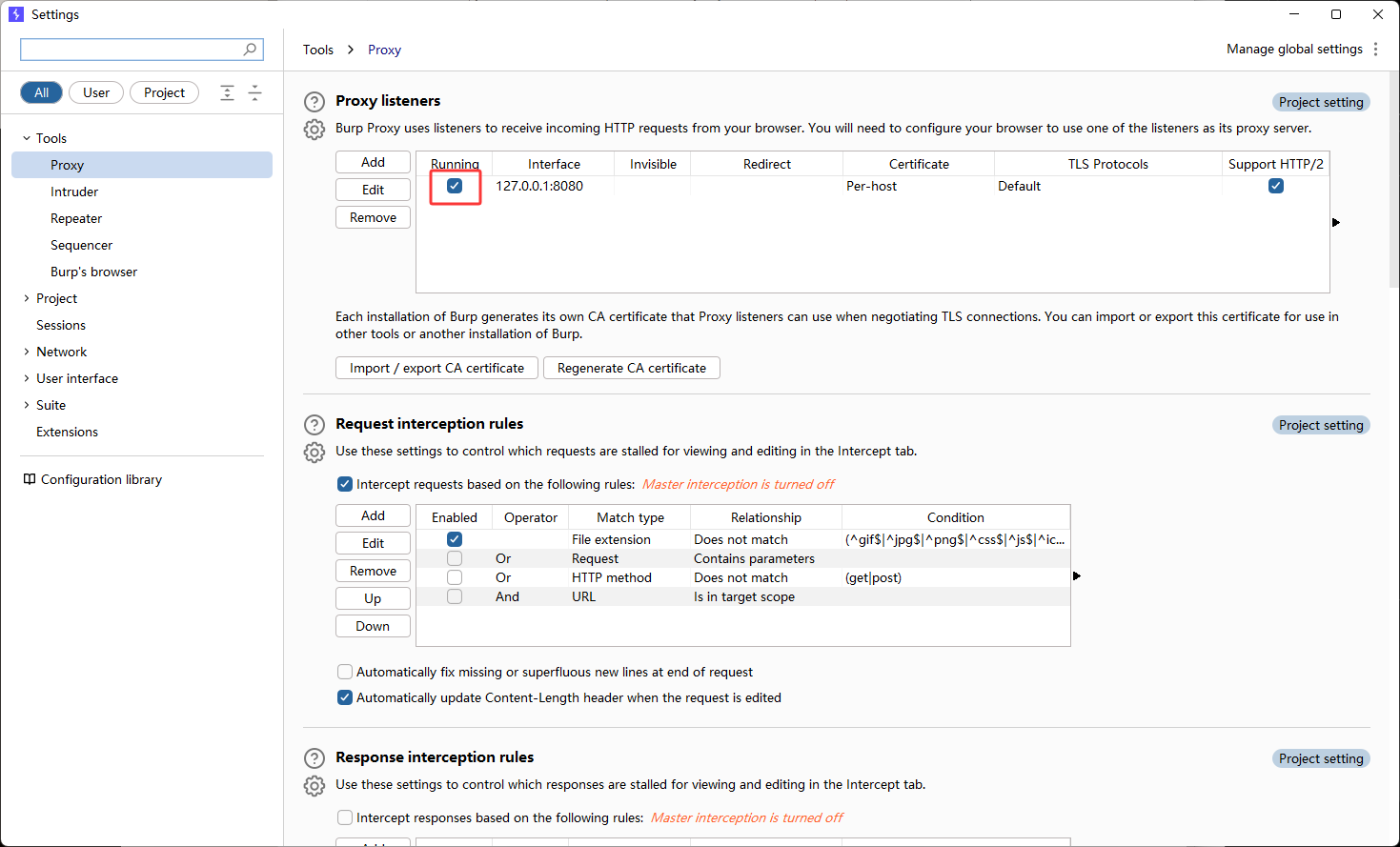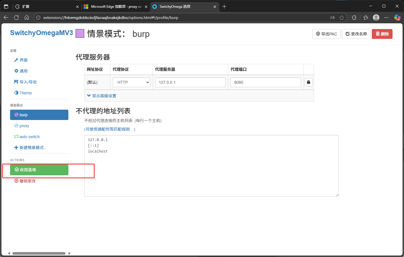 然后接下来就要让浏览器的流量先经过Burp,首先要保证下图打上了钩,这表示开启