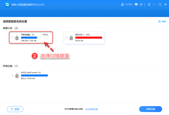 3. 在设备列表中选择连接的U盘/SD卡,点击“开始扫描”,软件会自动识别删除的图片、视频、文档等文件;