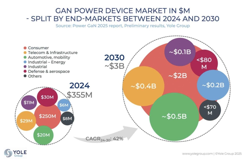 Yole集团发布了新版的Power GaN报告《Power GaN 2025》,其中预测显示,到2030年市场规模会达到30亿美元,2024年至2030年期间的复合年增长率为42%。Yole集团化合物半导体技术与市场分析师Roy Dagher表示:“Power GaN正从美好的愿景转变为切实的生产现实。在Yole集团,我们目睹了所有终端市场都在加速拓展。其具备的效率、紧凑性以及性能优势,使其当之无愧地成为未来十年电力电子技术领域的关键技术。”