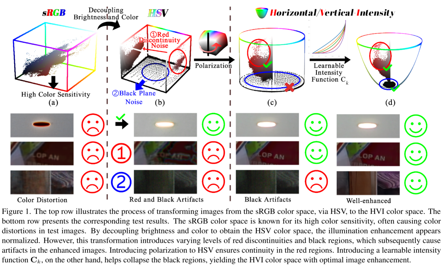 论文中有一张非常直观的对比图:同一张图片在sRGB空间增强后色彩失真,在HSV空间增强后红色区域和暗部出现严重噪点,而使用HVI空间后则近乎完美。(即最开头的图)