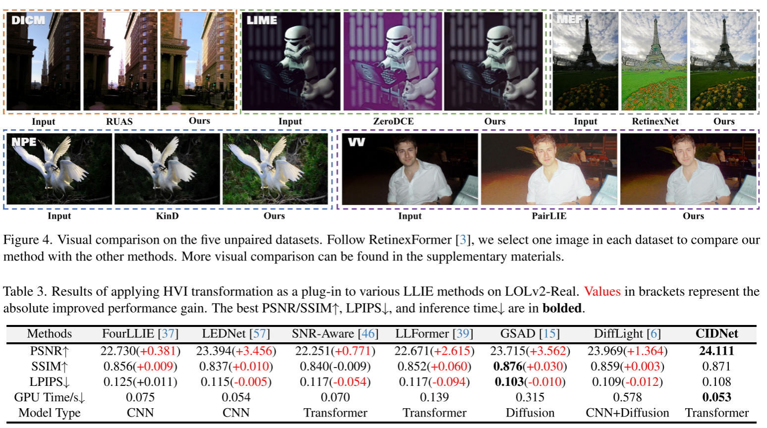 这证明HVI不仅适配CIDNet,而且是一个通用的色彩空间工具,可以广泛提升现有方法。