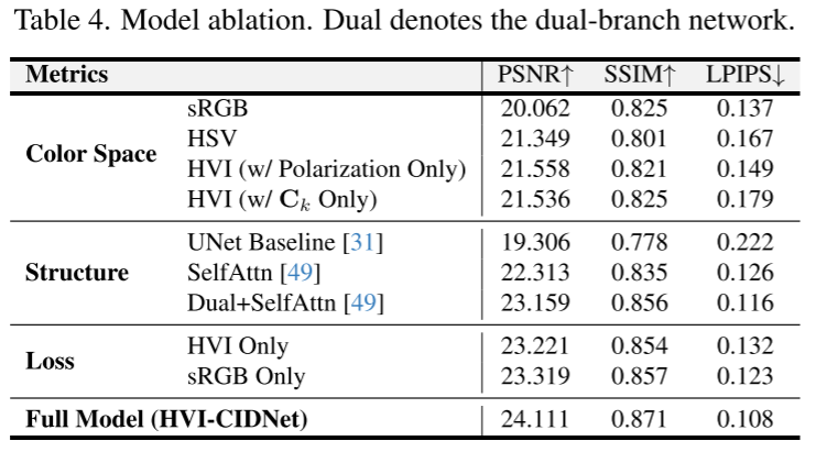 特别是在无配对数据集上的表现,虽然BRISQUE指标不是最优,但视觉感知质量明显更接近真实场景——这可能是因为HVI基于真实世界的感知模型(Kubelka-Munk理论)设计。