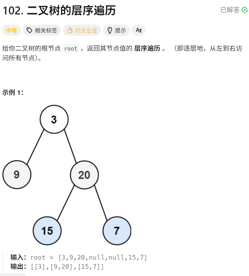 public:vector<vector<int>> levelOrder(TreeNode* root) {vector<vector<int>> res;if (!root) return res; // 防止空指针queue<TreeNode* > q;q.push(root);while(!q.empty()){vector<int> tmp;int levelSize = q.size();//使用这个是因为随着队列的出队入队,size大小会发生改变for(int i = 0; i < levelSize; i++){TreeNode* node = q.front();q.pop();tmp.push_back(node->val);if(node->left){q.push(node->left);}if(node->right){q.push(node->right);}} res.push_back(tmp);}return res;}