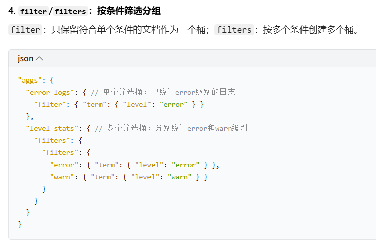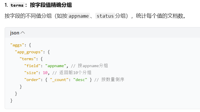 term:针对单个值的精确匹配,仅用于 “筛选符合某一个特定值” 的文档(如筛选appname=tg-portalweb)。terms:有两个场景,一是针对多个值的精确匹配(如筛选appname为tg-portalweb或tg-userweb),二是用于聚合分组(如按appname的不同值统计数据量)。