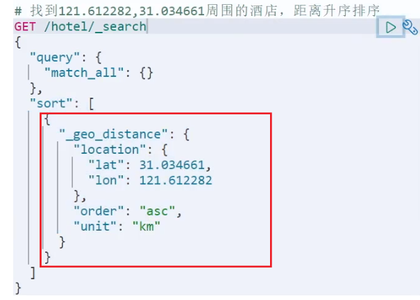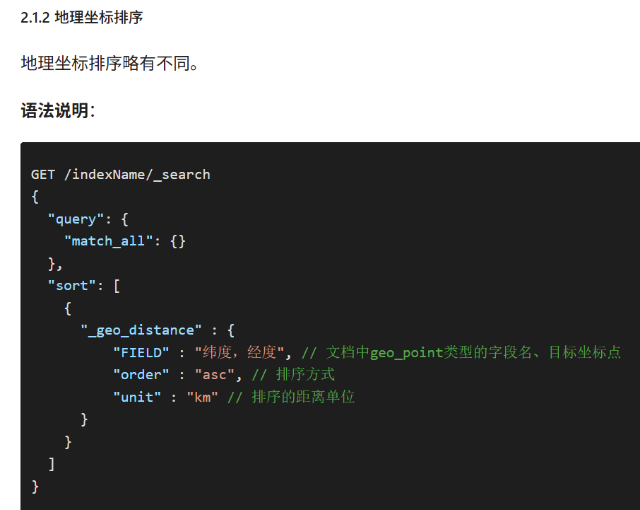 - 计算每一个文档中,指定字段(必须是geo_point类型)的坐标 到目标点的距离是多少