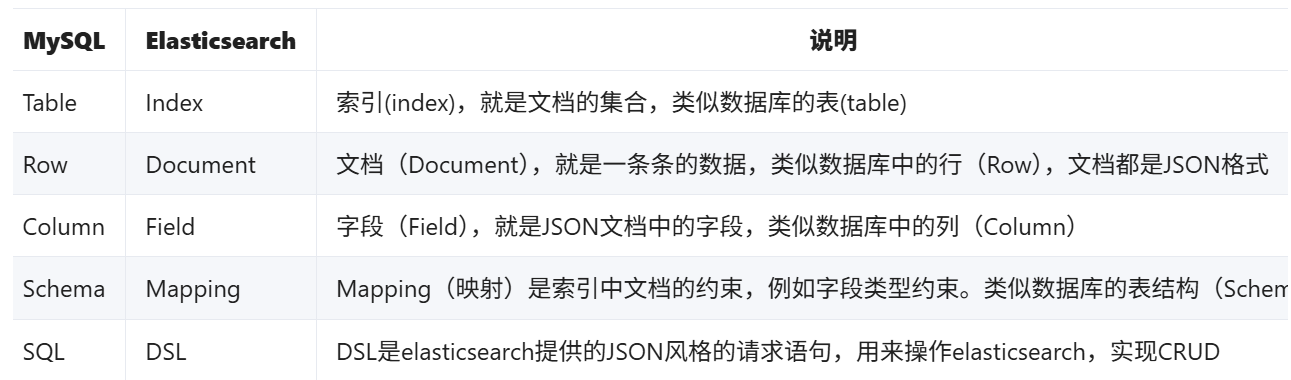 索引库就类似数据库表,mapping映射就类似表的结构。