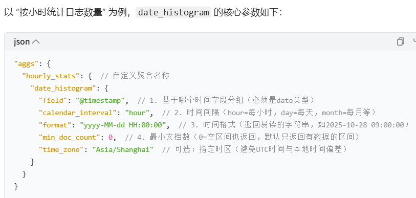date_histogram 是 Elasticsearch 中专门用于时间字段的聚合分析功能,作用是按 “时间间隔”(如每小时、每天、每月)对数据进行分组,统计每个时间区间内的文档数量(或其他指标),生成 “时间分布直方图”。