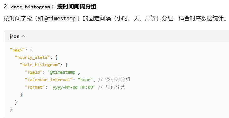 date_histogram:按时间间隔分组(如按小时 / 天)