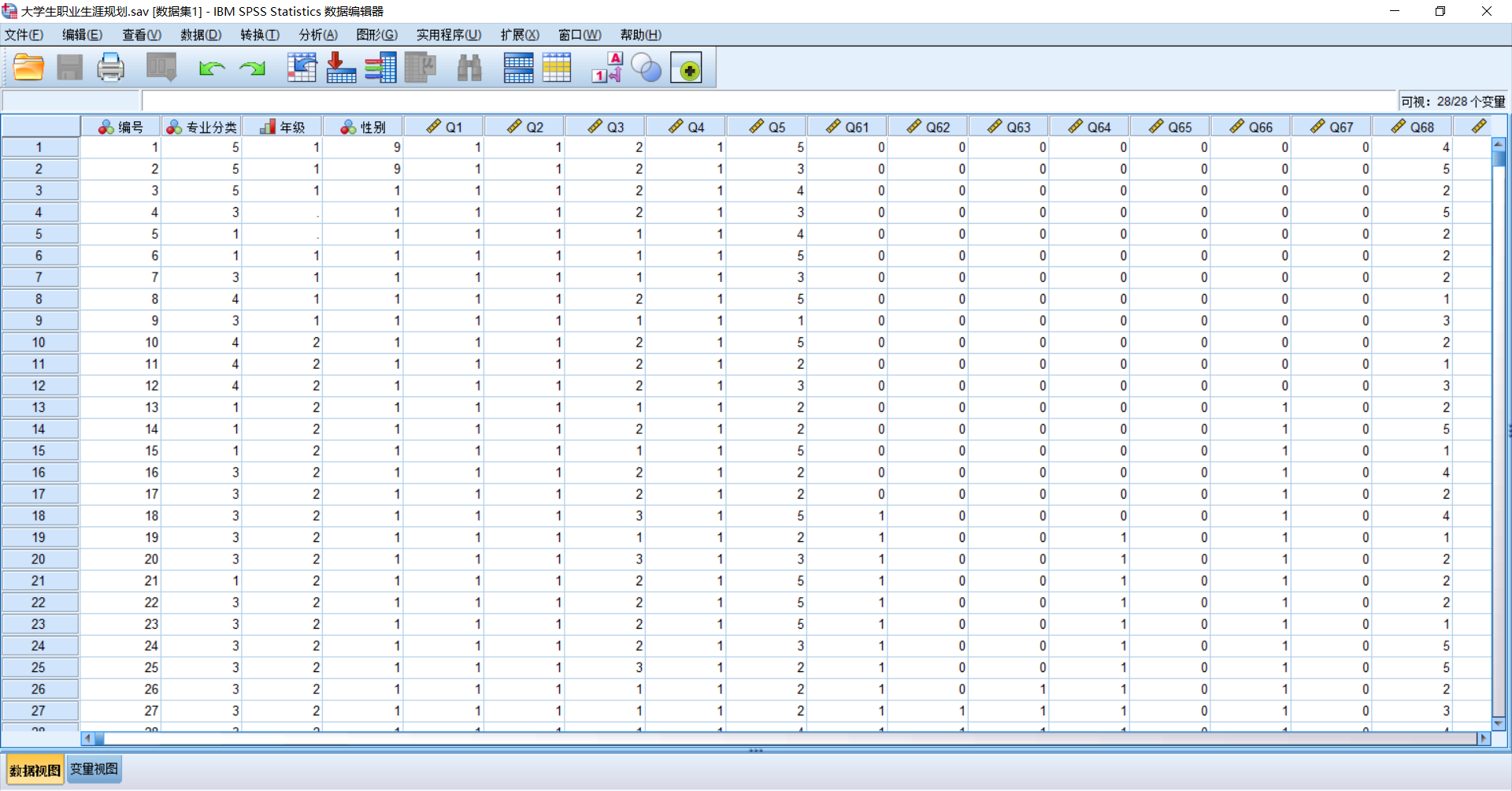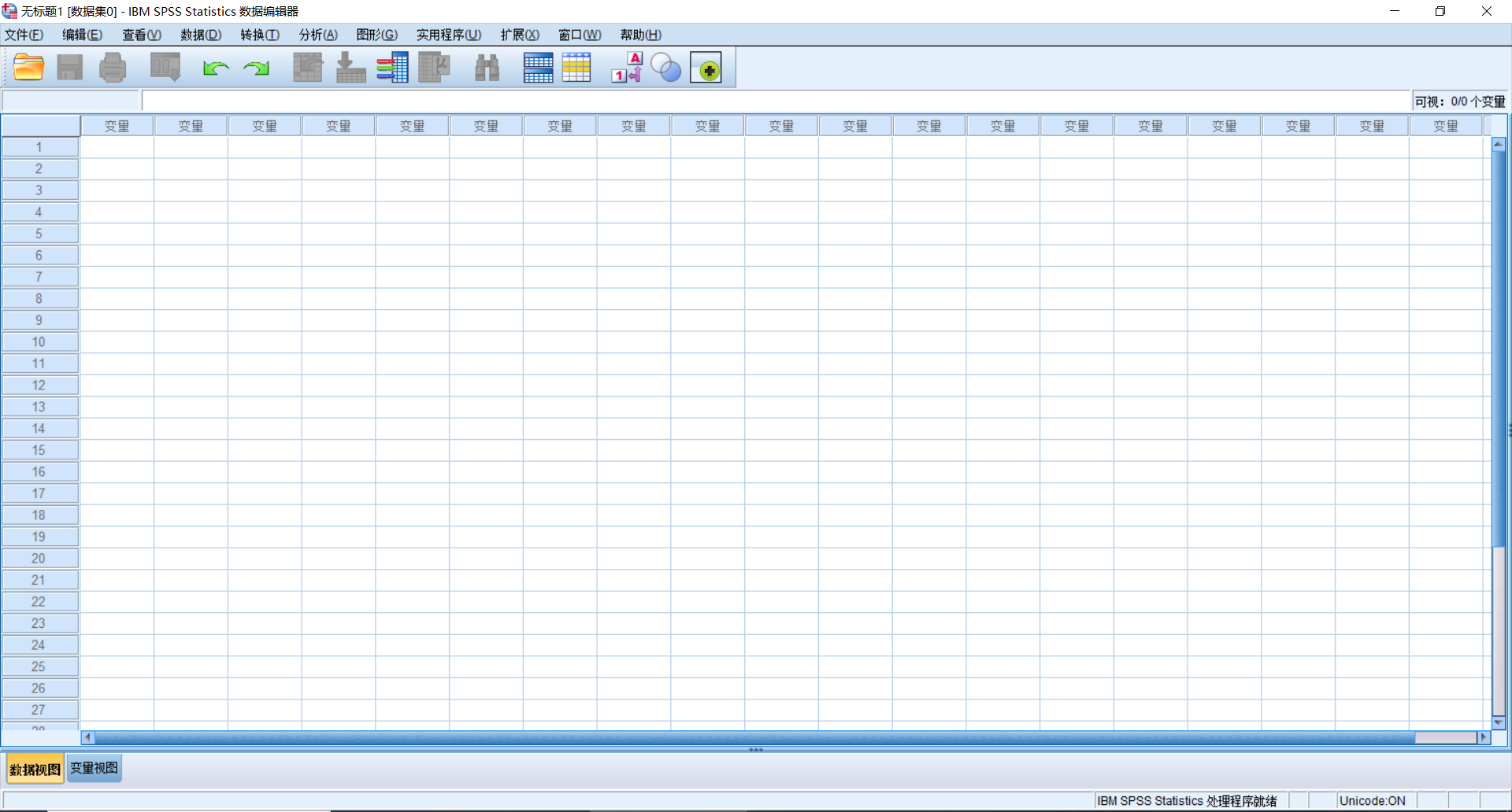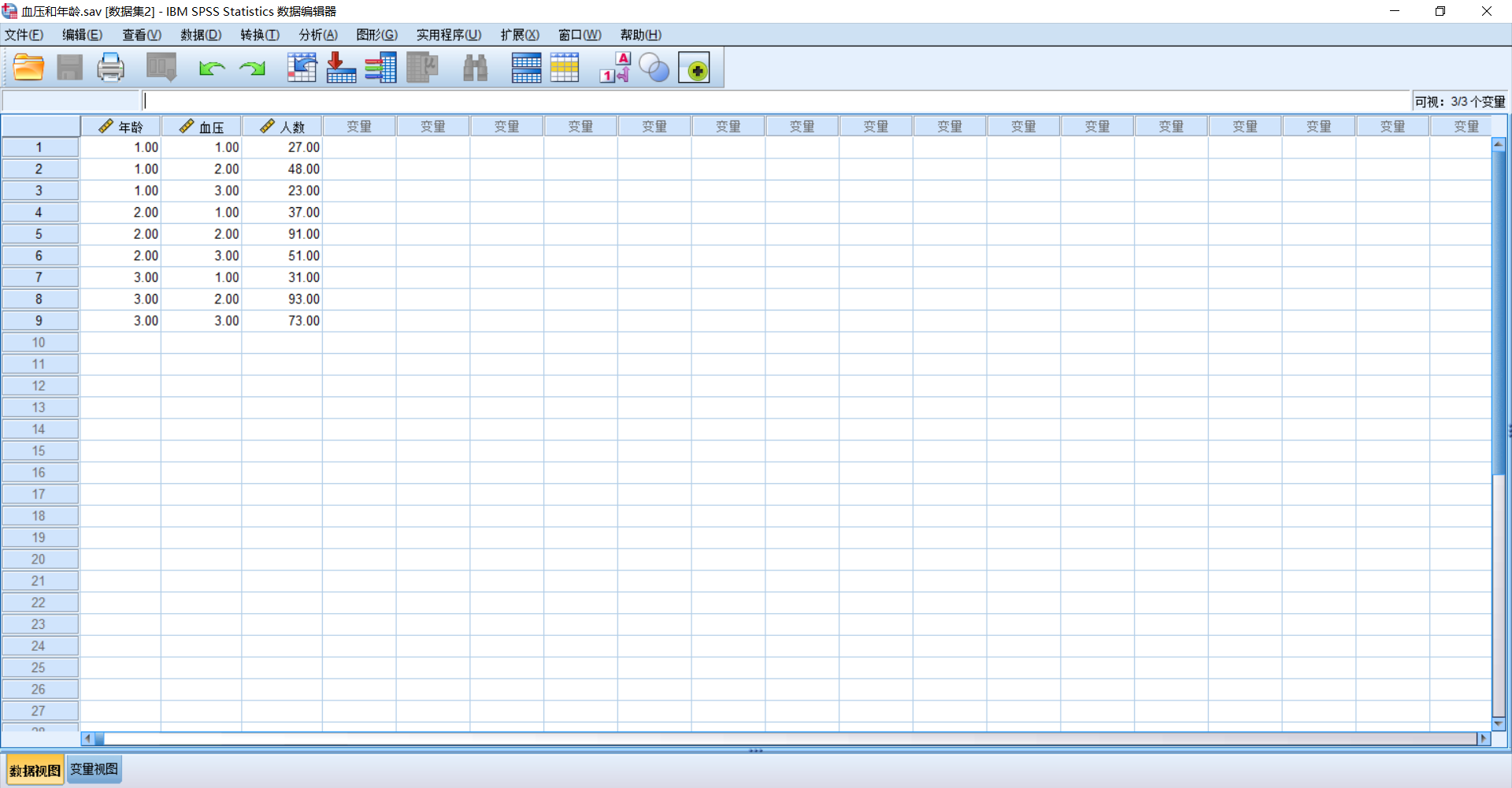 数据编辑器窗口中的一列为一个变量,代表某个问题(或某个方面的特征)以及相应的计数结构
