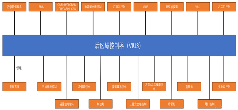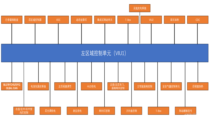 区域控制通过左右车身控制器的形式,将车身电子的负载接到左右域控制器上,实现了控制缩减线束的目的。 这些控制器支持各种车身控制功能,包括钥匙功能、尾门控制、车身控制、轮胎压力监测等,使得车辆在各个方面都能实现智能化的管理。