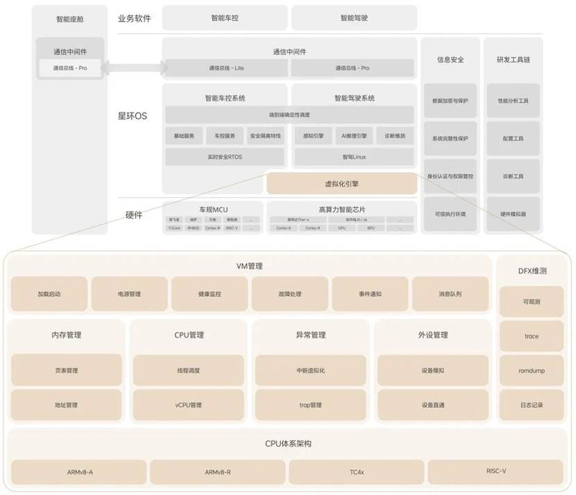 星环 OS 虚拟化引擎(LiVisor)是用于构建车端 AI 计算中心的虚拟化底座,它通过对 CPU、内存、NPU 以及 I/O 外设进行资源池化管理与安全隔离,在集中式硬件平台上支持车端智能驾驶、智能车控等多域业务的并发运行与协同。在底层充分结合硬件特性进行软硬联合定制化设计,满足不同客户机对冷热启动、跨域通信、高速外设访问等特性的高性能需求。