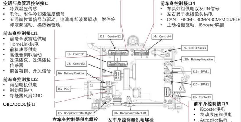 作用:负责前舱设备的配电和控制,同时为左/右车身控制器供电,为智驾Autopilot、座舱MCU供电。