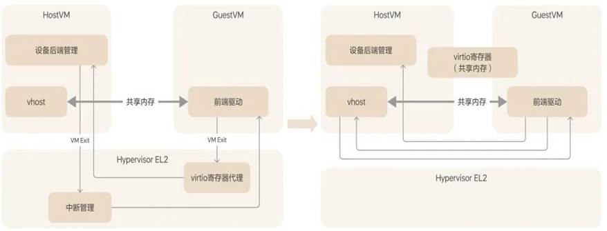 对车载域融合场景中 UFS、以太网控制器等非硬件虚拟化设备的共享需求,传统 virtio半虚拟化方案会导致 30%~40%的I/O性能损耗。星环OS虚拟化引擎重构vhost 控制面框架,推出基于virtio 的增强技术 VMExit-Less。通过消除虚拟机上下文切换(VM-Exit),显著减少数据传输时延,极大提升设备虚拟化吞吐性能。