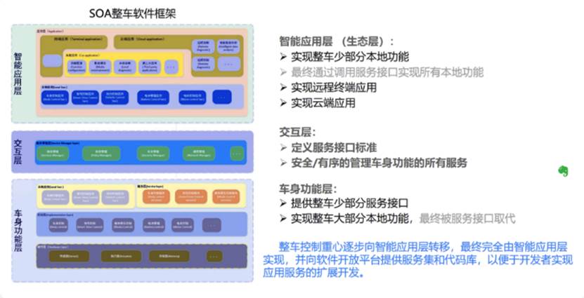 小鹏汽车的软件开发基于服务导向架构(SOA),将整车软件分为系统软件平台、基础软件平台和智能应用平台等层级,以便快速开发和迭代智能功能,如自动驾驶、智能语音车控车设等。