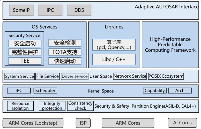 无缝兼容AUTOSAR,在安全方面,支持安全隔离,Safety-Critical与Non-Critical应用安全隔离,软硬件Co-Design,去中心化架构,屏蔽单点软硬件故障,在确定性延迟方面是开源Linux的十分之一,内核延时小于10us,支持CC EAL4++。