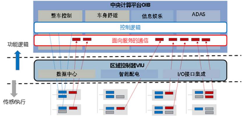 是以SOA架构为核心,以功能IPO模型为核心,进行了三层功能分配。该架构将功能逻辑的核心集中于中央计算平台OIB,实现了整车控制、舒适性、信息娱乐及自动驾驶辅助(ADAS)功能的深度融合。