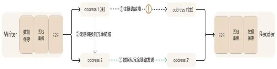 星环 OS 通信中间件不仅支持 E2E 校验、丢包重传、按序到达以及网络拥塞控制等基础传输可靠性保障机制,还实现了多路冗余传输方案、共享内存异常无感恢复等可靠性增强方案,确保关键指令(如主动安全相关指令)能够可靠到达,同时实现传输低延迟,以适应严苛的车规级环境。其中多路冗余传输方案的原理如下图所示:
