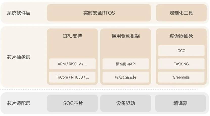 智能车控OS采用了内部设计实现了一个逻辑清晰、交互间接的芯片抽象层,通过多维度抽象建模(覆盖 CPU、驱动、编译等),有效屏蔽了底层硬件差异,为上层系统提供了一致且稳定的视图。这种“隔离”设计使得适配新硬件时,把原本需要的绝大部分修改提取到抽象层内部,并借助自动化代码生成工具,适配工作量被大幅削减。