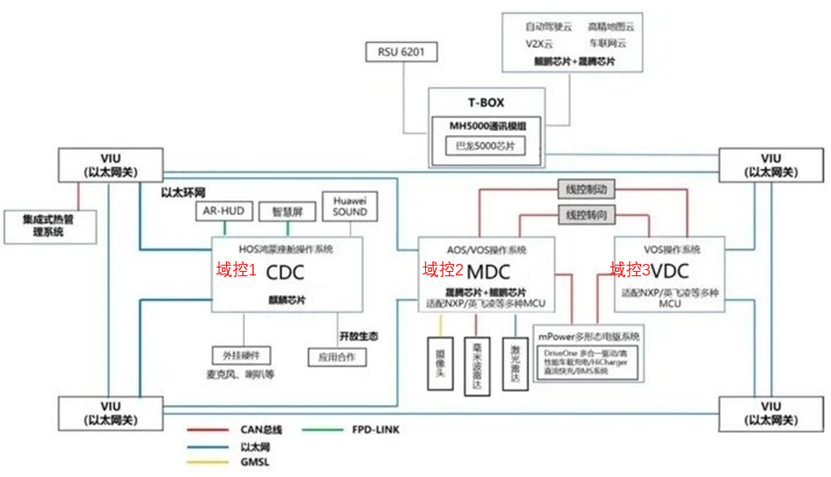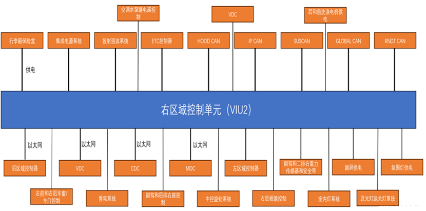 智能座舱域控制器CDC主要负责信息娱乐功能,智能驾驶域控制器MDC主要负责自动驾驶功能,整车控制VDC主要负责整车及底盘域的控制,相应的传感器、执行器甚至部分ECU就近接入。3-5个VIU之间通过高速以太网的环形网络进行连接,确保整车网络高效率和高可靠,实现数据传输、I/O口隔离等功能。