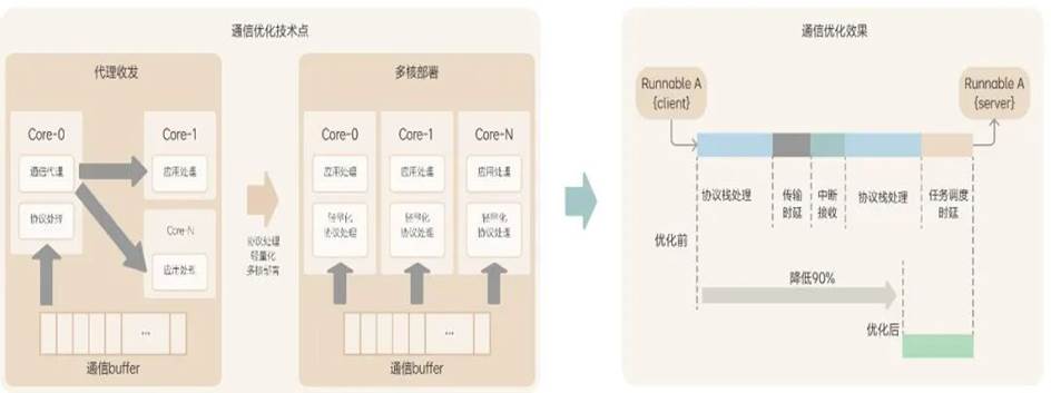 智能车控 OS 内部基于自研确定性网络、轻量化协议栈、协议栈多核部署等关键技术,大幅缩短了远端访问时延。