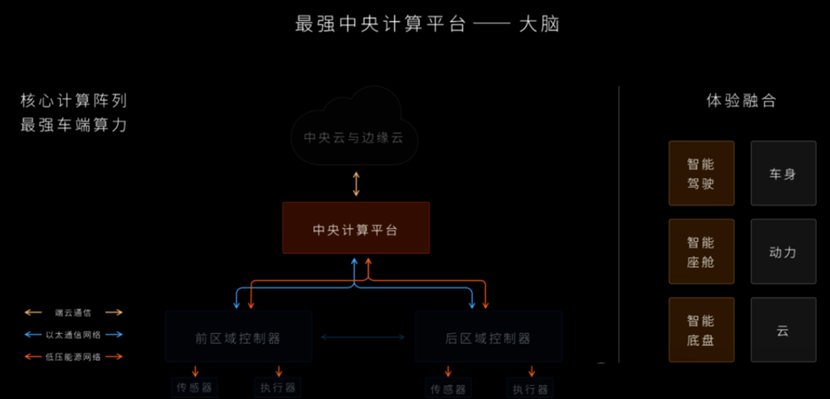 在硬件上采用各领域内最先进的芯片,并通过高带宽低时延Switch级联,实现算力扩展和多域融合;