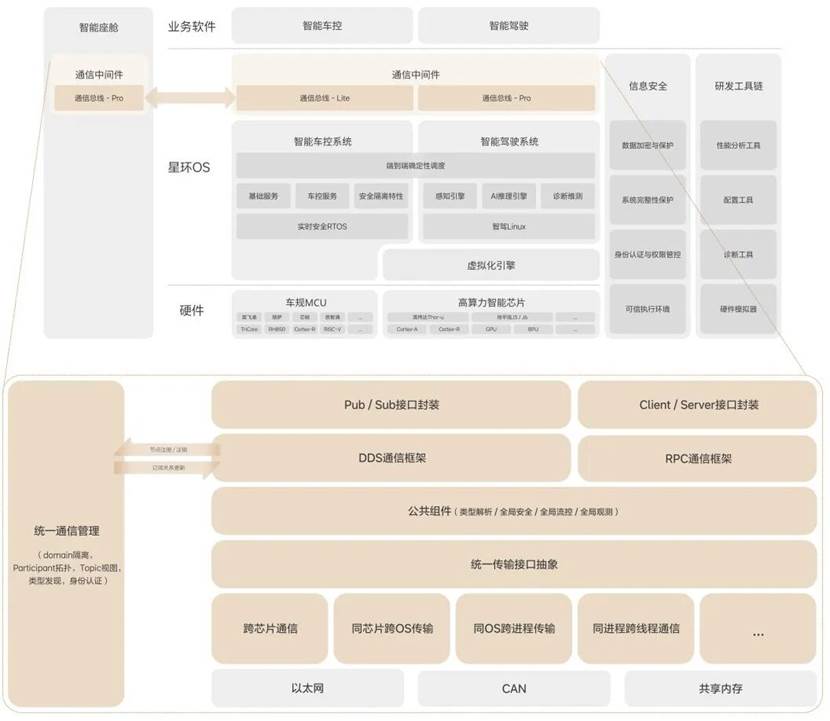 当前行业内的通信中间件仅能在限定域场景下解决部分问题,导致车载场景全域系统部署时通信协议割裂,工程化管理与维护成本很高。星环OS通信中间件基于车载场景实现定制化的DDS通信协议,实现面向MCU轻量化设计,构建起真正全域统一的通信基座,核心特点如下: