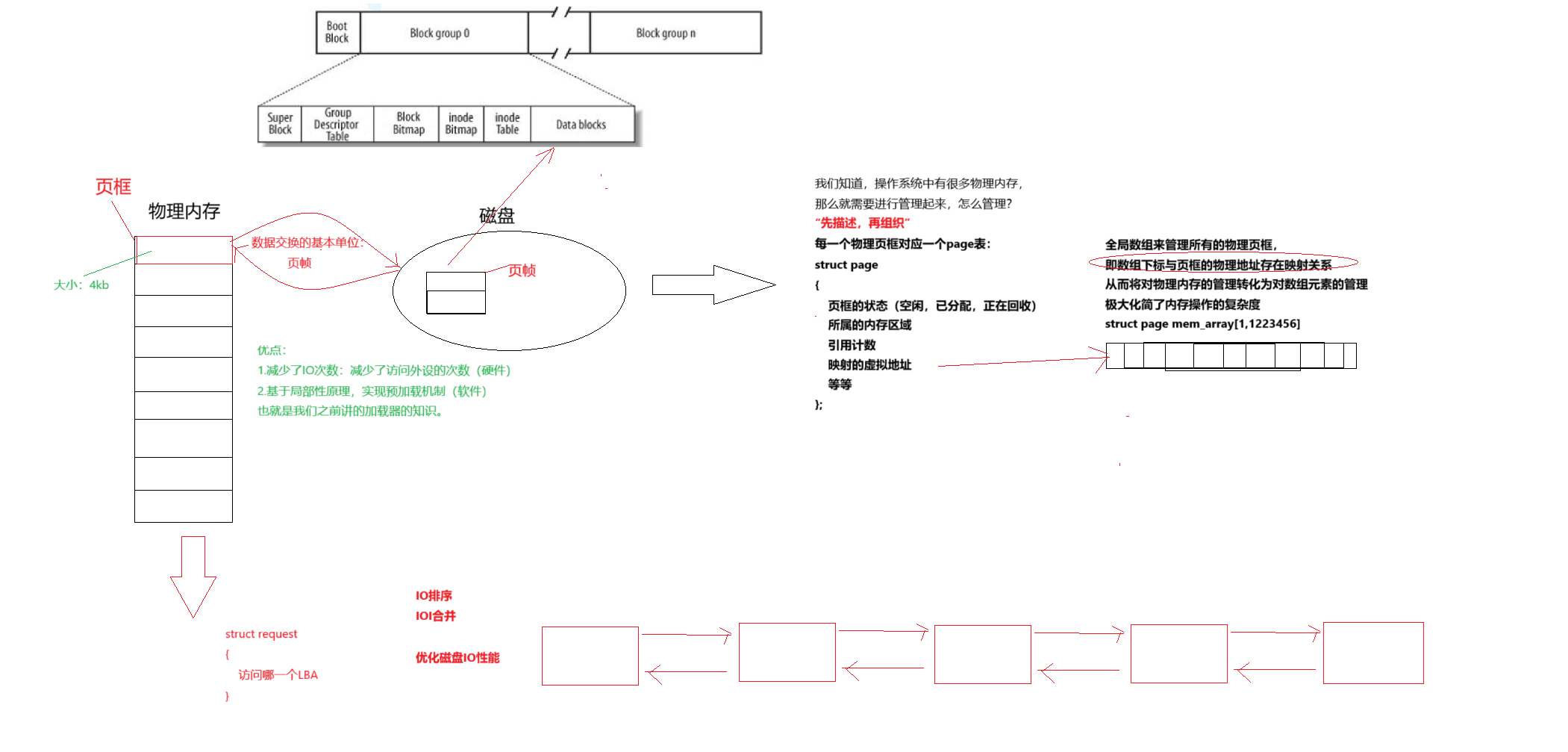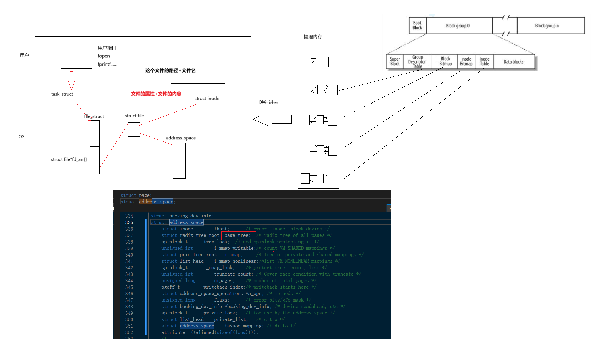 - 磁盘上的文件系统组件:操作系统通过设备驱动管理磁盘物理地址,实现“磁盘物理地址→内存物理地址→虚拟地址”的层级访问。